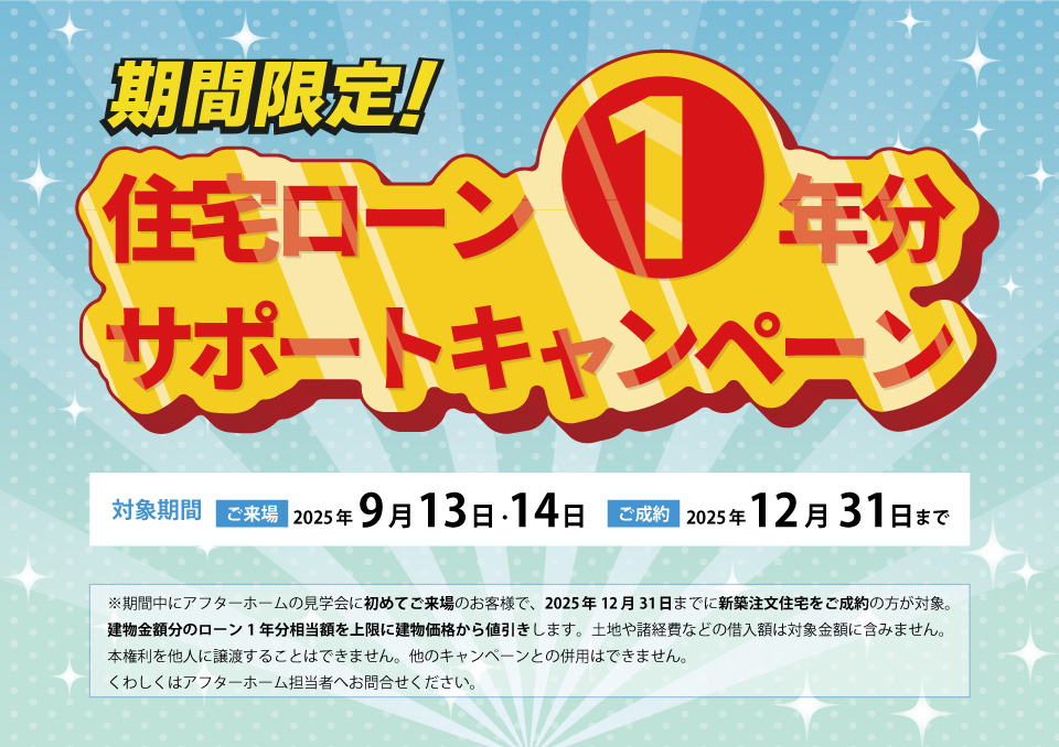 アフターホームでは期間限定で「住宅ローン1年分サポートキャンペーン」を実施します。