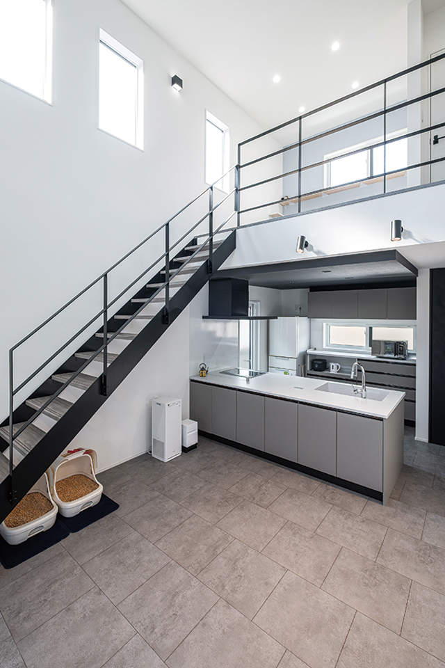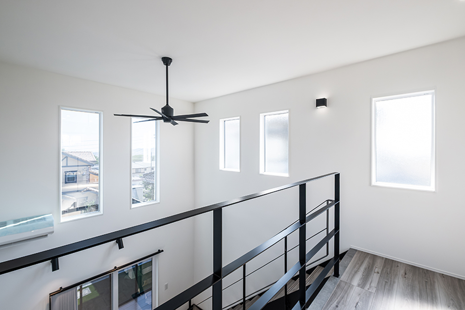 アイアンのスケルトン階段と2階ホールの手すりで、さらに開放感がアップ。 -