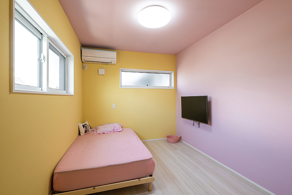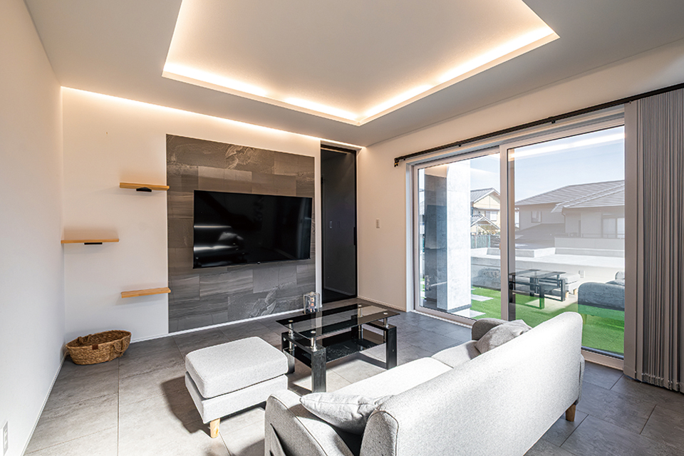 大きめの窓で日中は明るく、夜はテレビボードと天井の間接照明で落ち着きのあるくつろぎ時間が過ごせます。 -