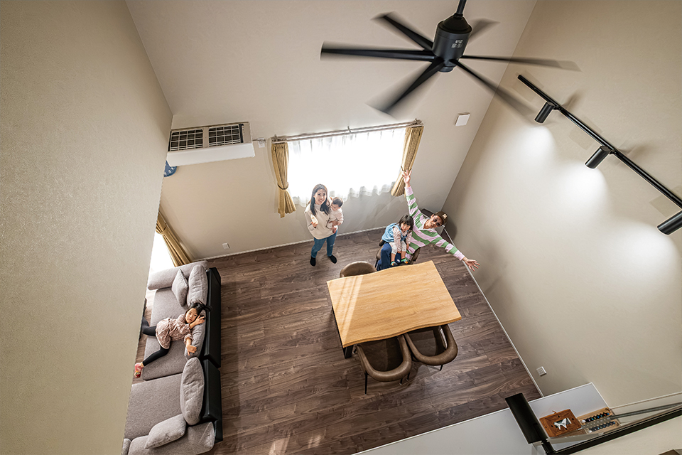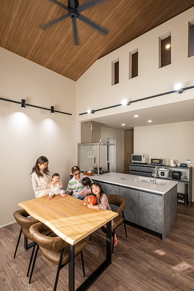 小屋裏空間ともゆるやかにつながり、どこにいても家族の存在を感じられる、安心感のある住まいの中心です。