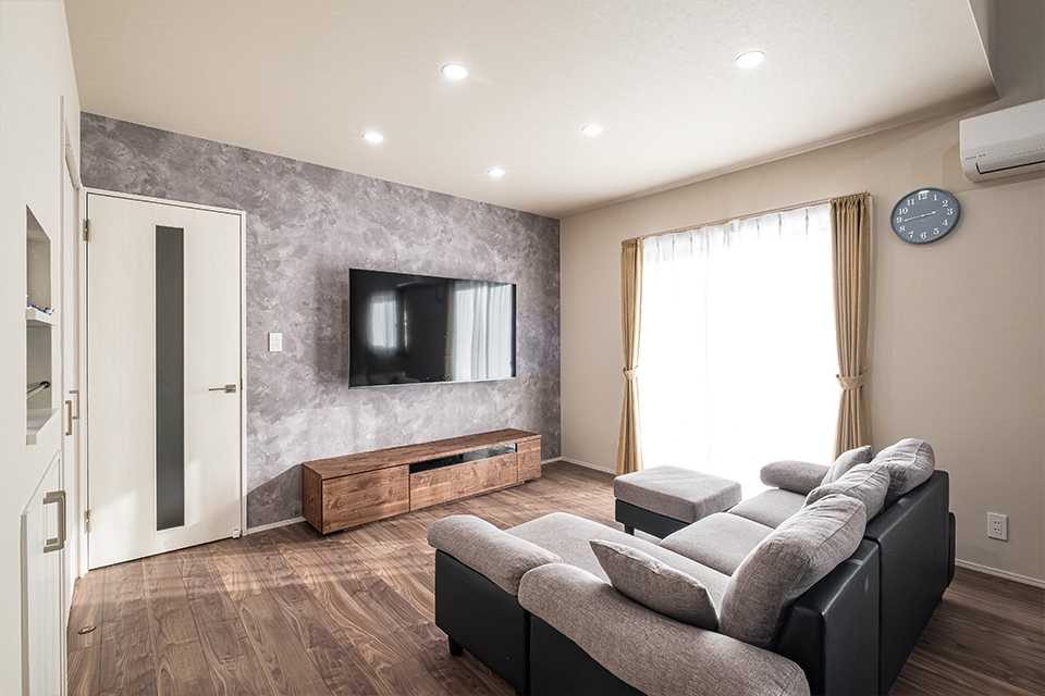 • やわらかな光に包まれるリビングは、白とグレーを基調に木目をアクセントとして取り入れ、上質で落ち着いた雰囲気にまとめました。