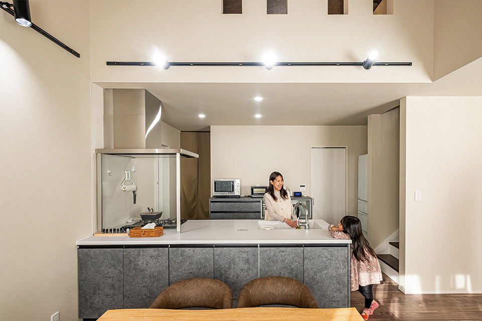 • 吹き抜けが広がる、明るく開放的なダイニングキッチン。