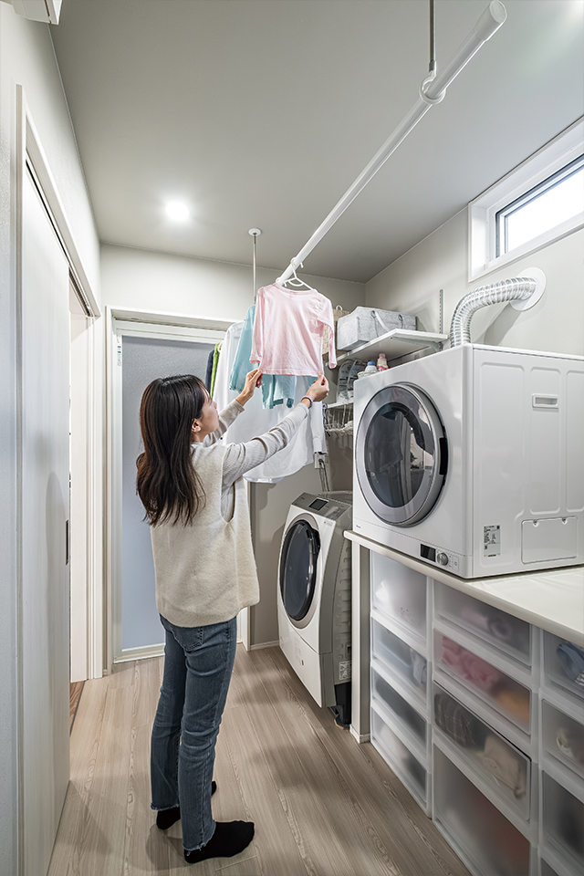 移動の無駄を減らしたレイアウトに加え、ガス衣類乾燥機の導入で、共働き・子育て世帯の家事負担を効率よく軽減します。