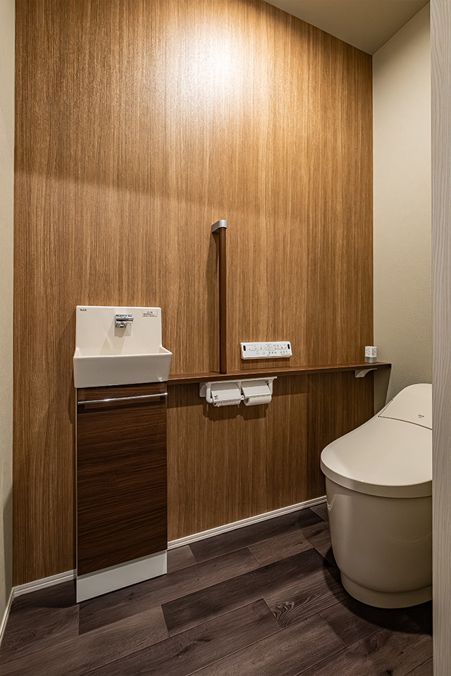 • シックな色合いでまとめた、落ち着きのあるトイレ空間。