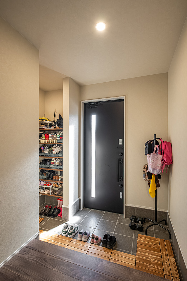 • 玄関には、靴はもちろん外遊びの道具までしっかり収まるシューズクローゼットを設け、すっきりとした空間を保てるよう工夫しています。